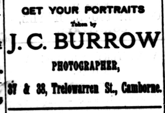 Before he was twenty, Burrow had already found his life’s calling. Before he was thirty, in 1881, he was living in Camborne and set up as a “Photographic Artist”; his most well-known residence, and place of business, was “Camara”, on Trelowarren St4.