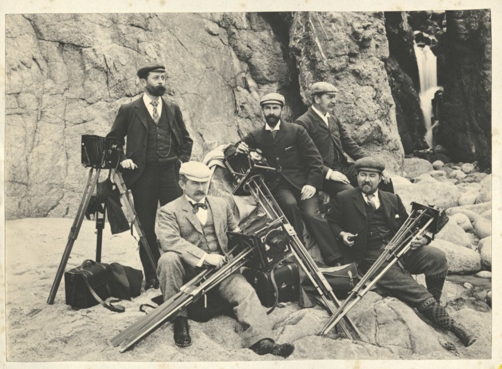 Millbank, Lands End, 1898. Note the array of equipment. Back, l to r: William Thomas, co-author of ‘Mongst Mines and Miners, Herbert Hughes, underground photographer of Staffordshire collieries, and J. C. Burrow. The gentlemen in front remain unidentified. Image courtesy Kresen Kernow, ref. corn03899