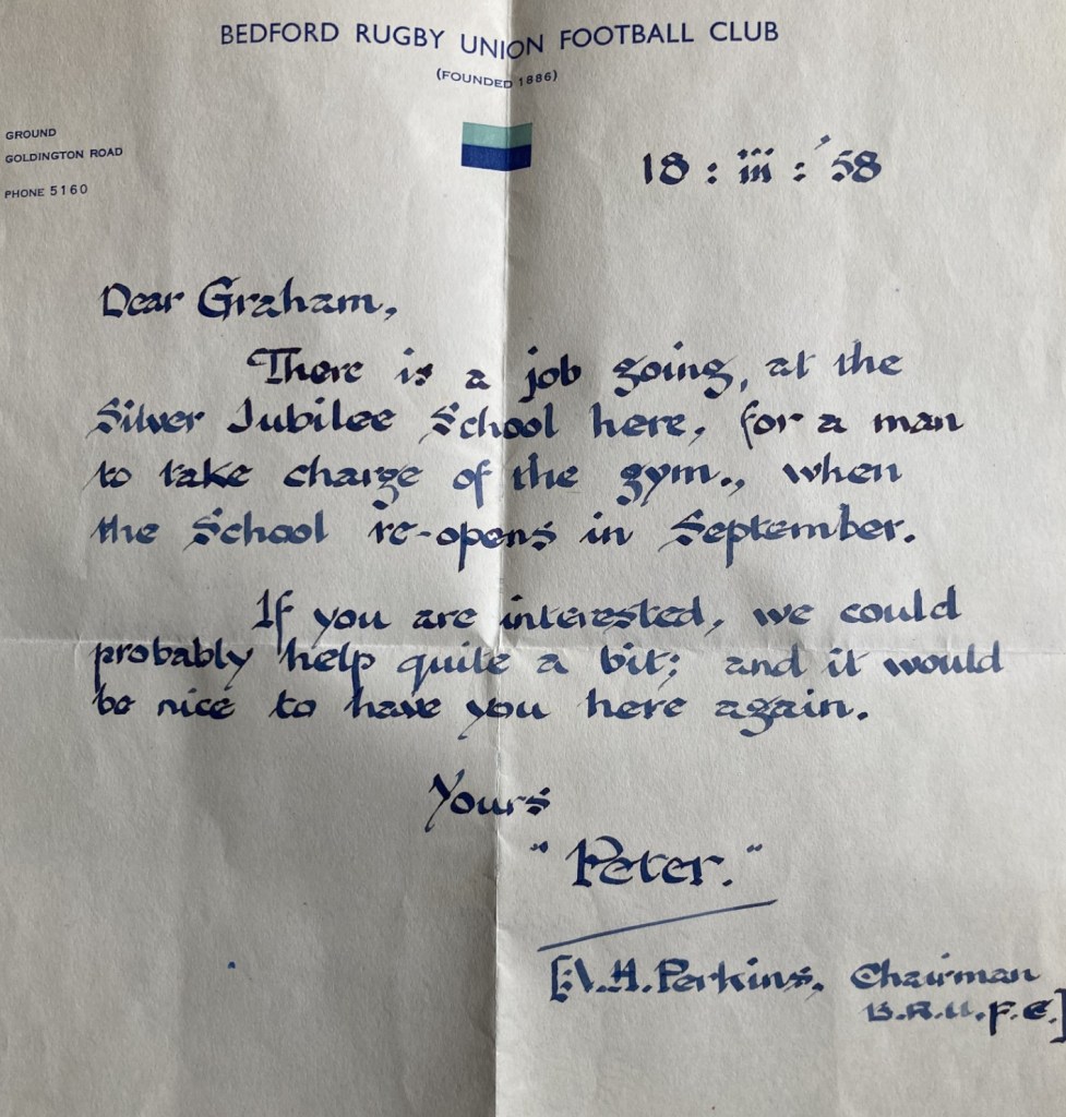 When I was leaving the RAF, it became pretty common knowledge in the rugby world, and that I was looking for something or other. Bedford wrote to me, and this is the letter…