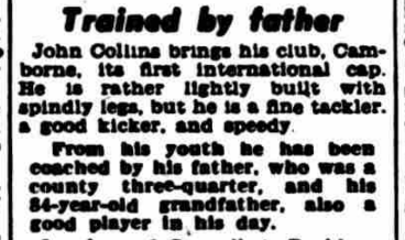 John’s father, Phil Collins, is remembered today as one of Camborne RFC’s greatest players. He was good enough to play for Cornwall against the 1924 All Blacks5.