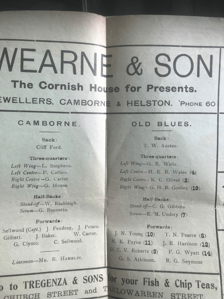 The Old Blues were no fixture-padding also-rans. In a legendary era of Camborne rugby, with players such as Reg Parnell, Bill Biddick, Fred Rogers and Phil Collins (the father of John), the Blues “badly trounced” Town 31-5 in 192745.
