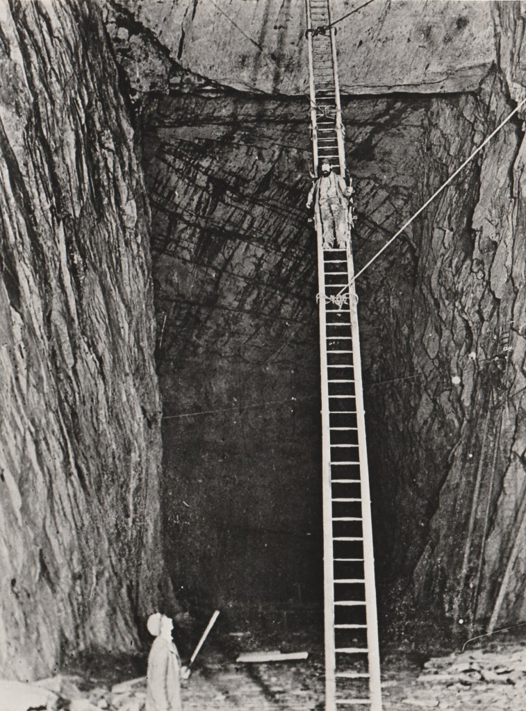 Before descending 500ft, or 83 fathoms, the tour guide gave our party the obligatory health and safety briefing. Whilst talking, he made reference to an old photograph, displayed amongst a selection of slate-cutting paraphernalia (see above). A group of quarrymen (or pare in Cornwall), are hand-drilling whilst precariously balanced on a sheer face of slate. The chains around their thighs are a token gesture to safety: it’s a 50ft drop below. Standing officiously above them is the shift supervisor or foreman. This was taken in the 1890s.