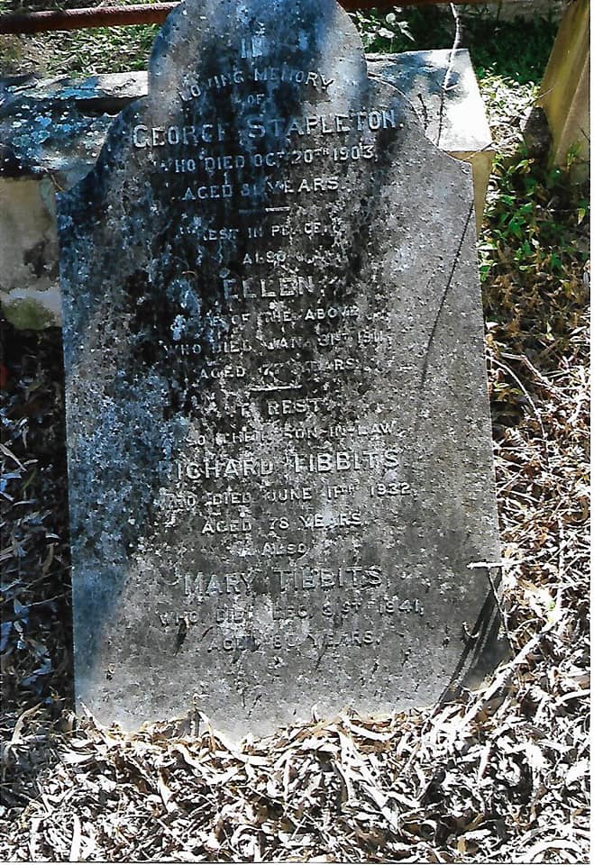 George Stapleton was held for a time in the prison hulk Justitia, near Woolwich, arriving in Moreton Bay in 1850. He was shortly granted a ticket of leave, and married Ellen Wallace in 1853. They had nine children. Stapleton died in 1903, and is buried in the Toowong Cemetary, Brisbane22.